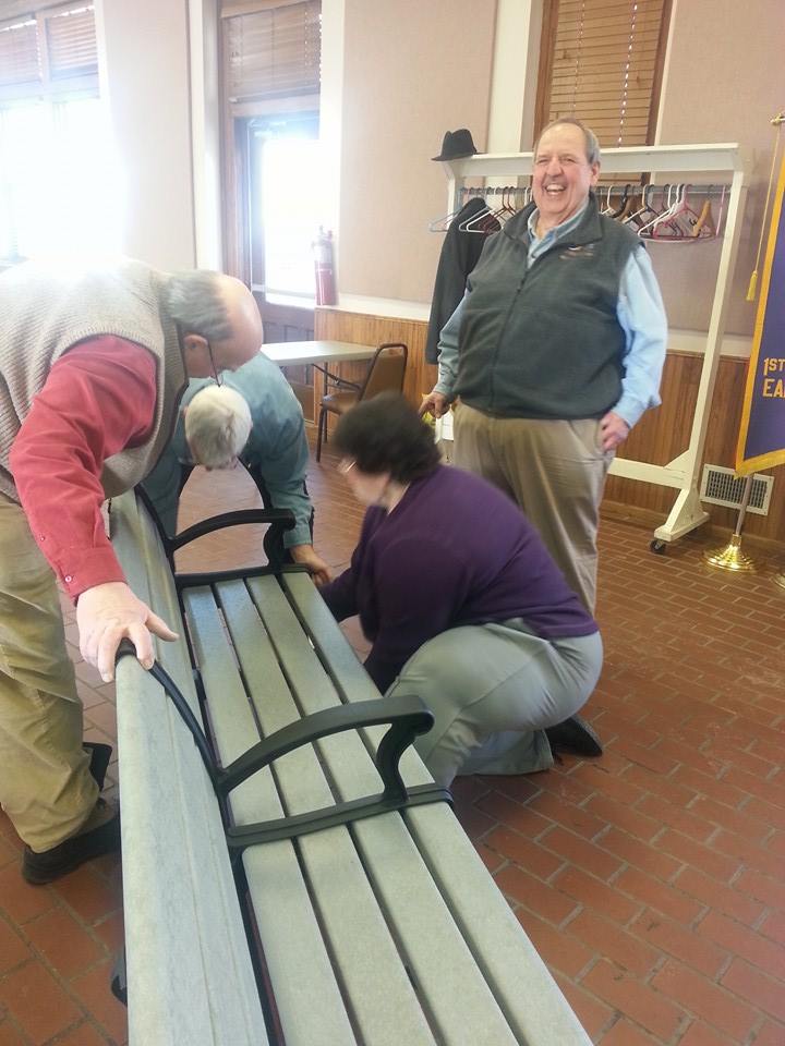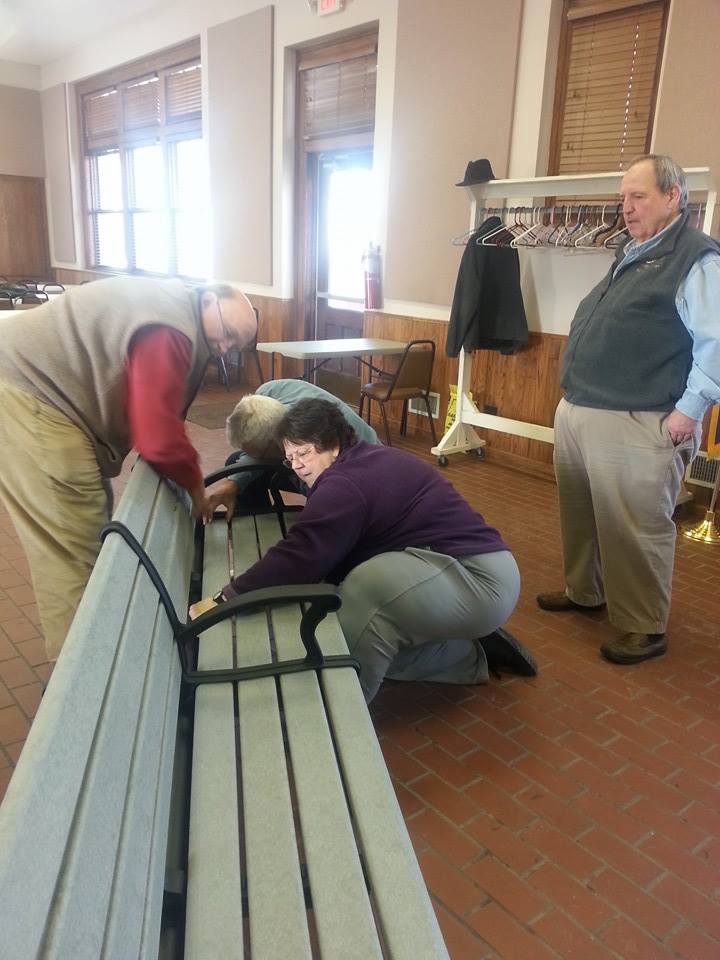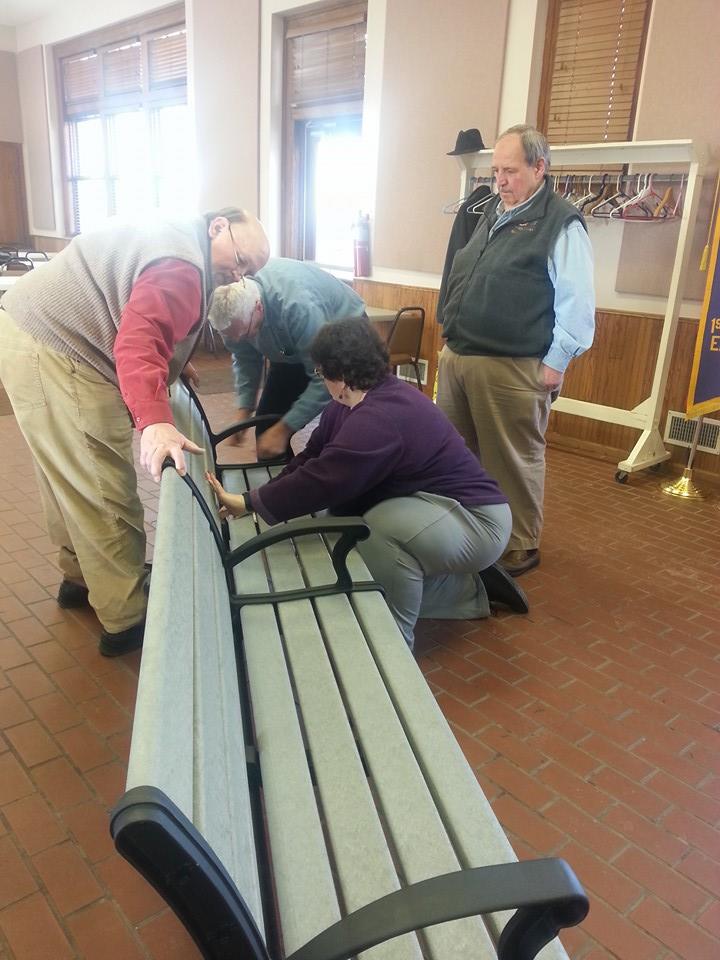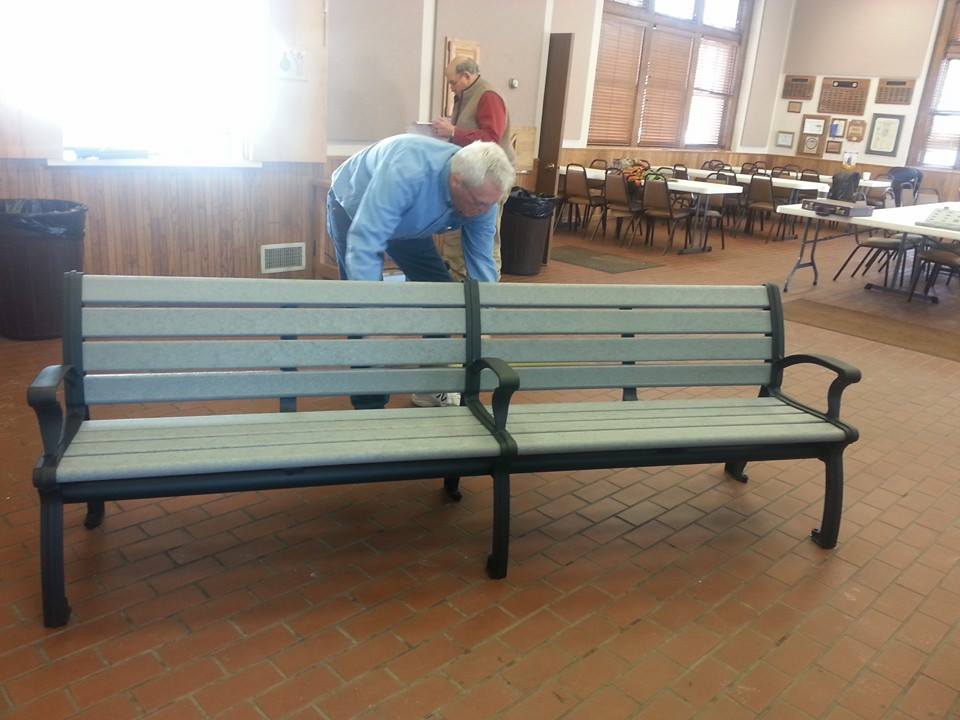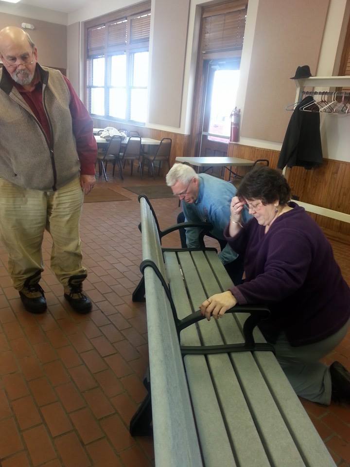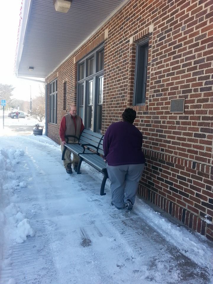 Just in time for Winterfest, the first of two new Memorial Benches are displayed outside the train depot.  Many hands made the project quick work.  One more to go.