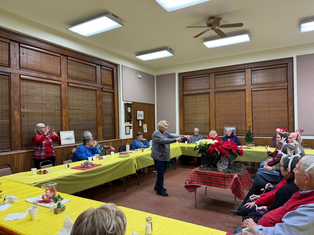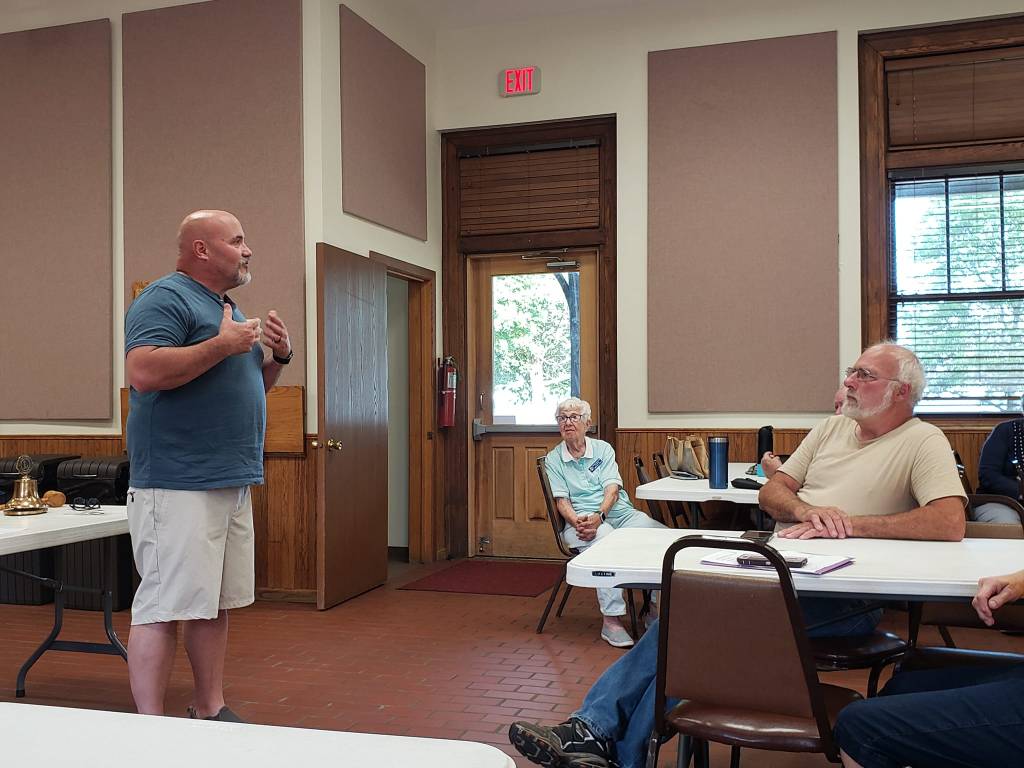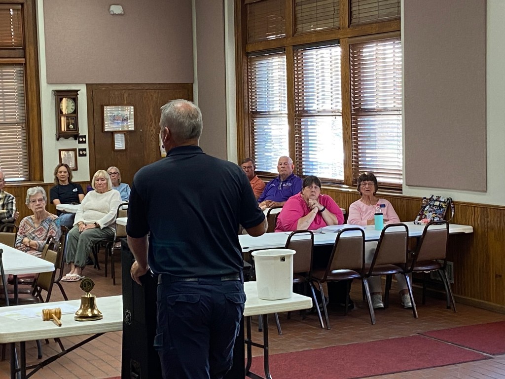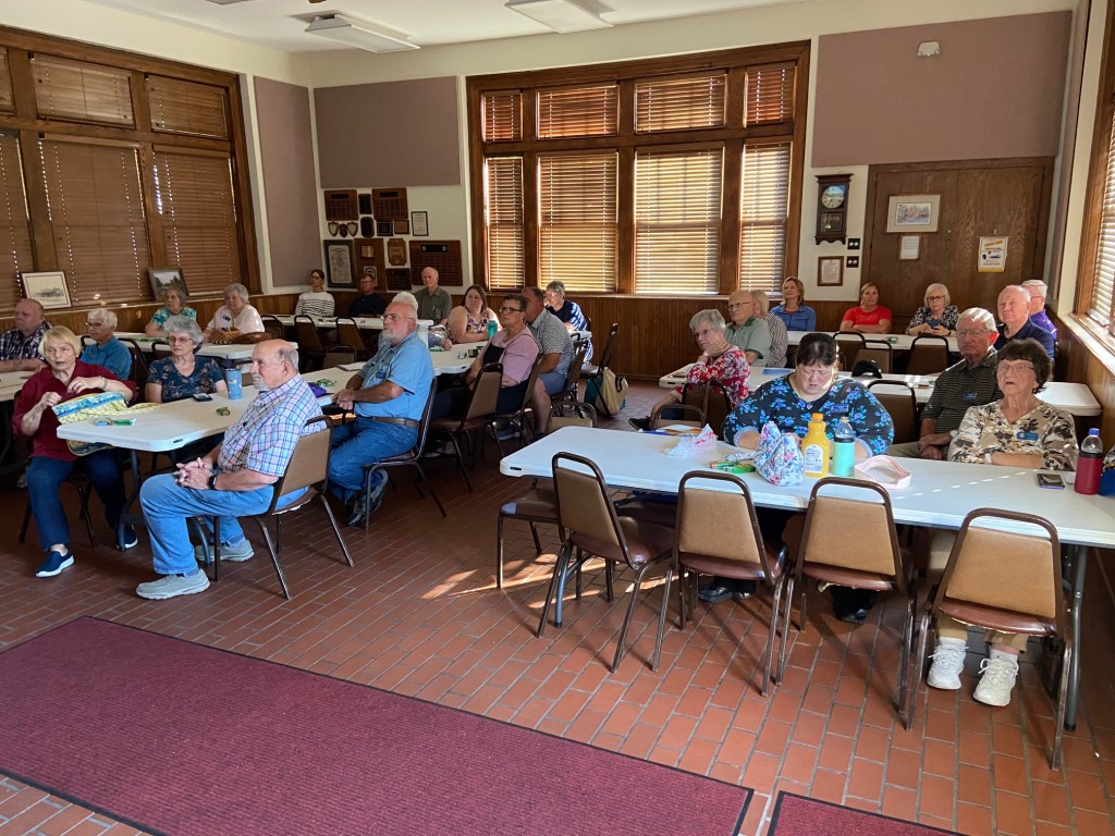 View from one end of the Kitchen. Fridge on the immediate left.Counter in front opens to the main room. Counter space behind.Grill, oven, and more counter space. Sink directly behind the grill.East end of the room has restrooms.West end has tables set up and windows with Venetian blindsSouth side of the room has an exit door towards the lake and West entrance to the kitchen area.West end of the room.North side of the roomView from the West end towards the kitchen and restrooms.Tables can be arranged into a large square.